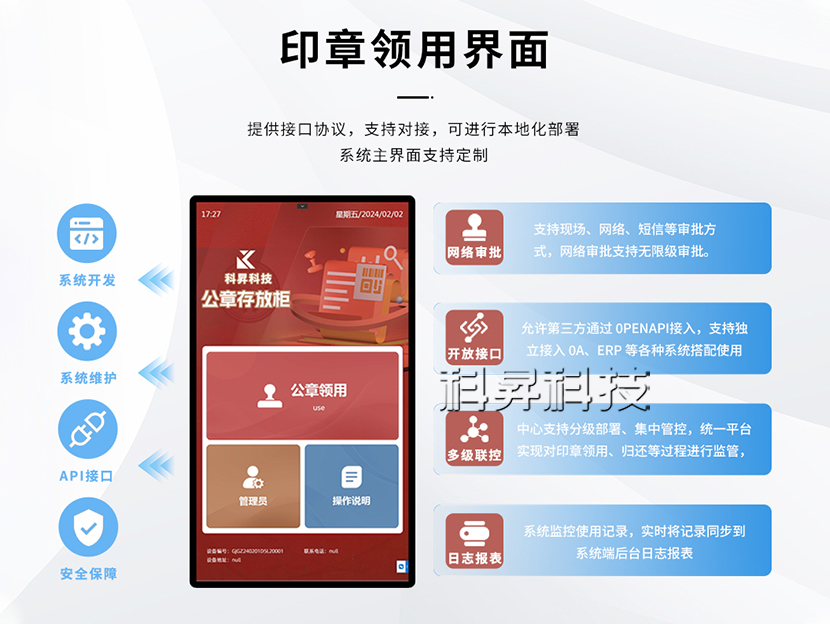 西安科昇科技有限公司長期供應智能物聯網設備軟硬件集成服務、支持軟件開發、硬件對接、系統二次開發等技術服務。主要經營:政務大廳智能文件交換柜、A存B取智能公文交換柜、企業單位智能文件流轉柜、智能印章管理柜、智能驗訖章自助領用柜、智能回單柜、智能卷宗柜、智能儲物柜、 智能工具柜、RFID智能柜、智能耗材柜、智能收費寄存柜、智能手機存放充電柜、社區共享智能柜、智能售賣柜等系 列智能化產品。