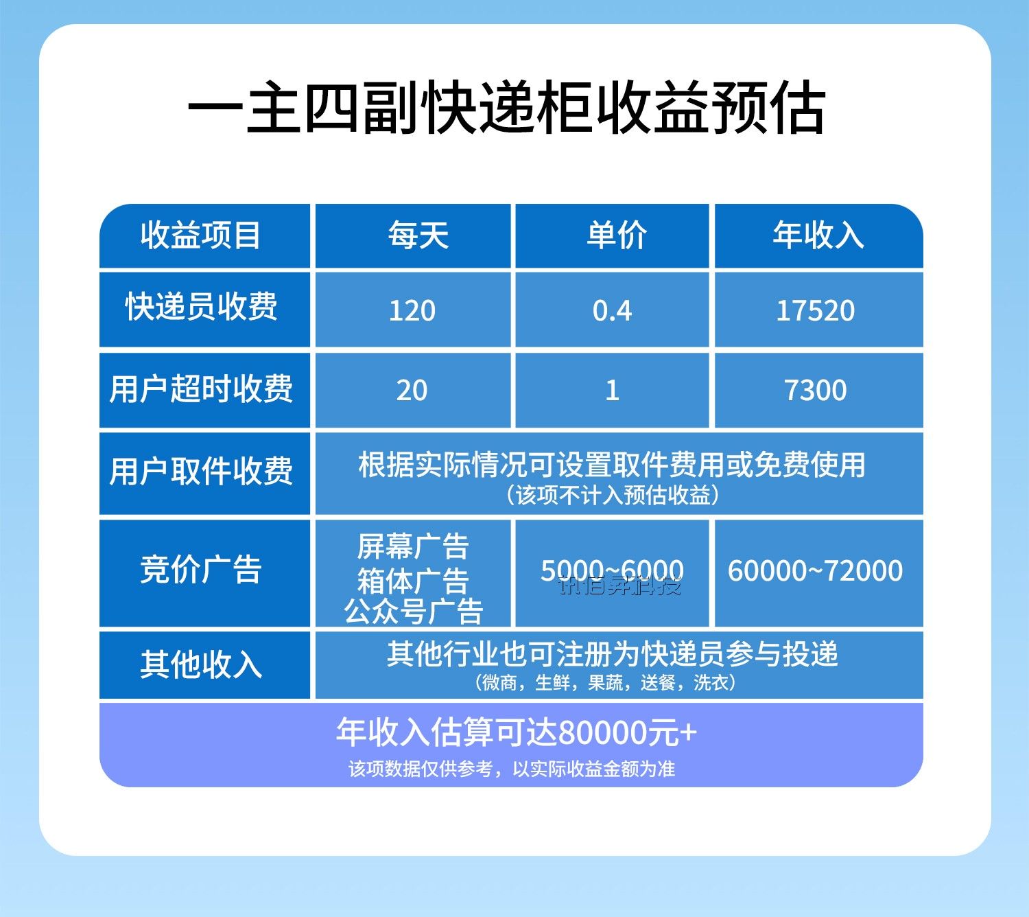 1、快遞員存件收費:按照大小箱門0.3-0.6/件,100件預估在45元/天